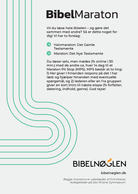 Bibelnøglen har lavet maratonlæseplanen i en frisk og indbydende layout lige til at gå til. Den kan bruges alene, eller som et fælles bibellæsningsprojekt i for eksempel en ungdomsgruppe eller bibelkreds. Du kan bestille en stak eller downloade den selv.
